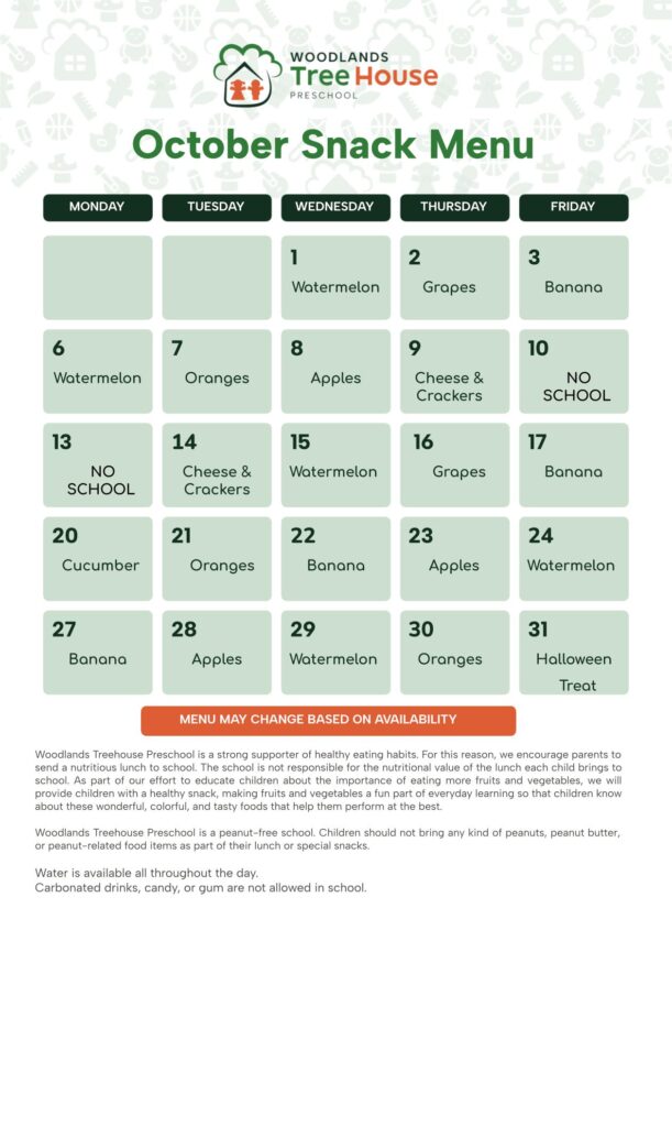 Woodlands Tree House Preschool is a strong supporter of healthy eating habits. For this reason, we encourage parents to send a nutritious lunch to school. The school is not responsible for the nutritional value of the lunch each child brings to school.